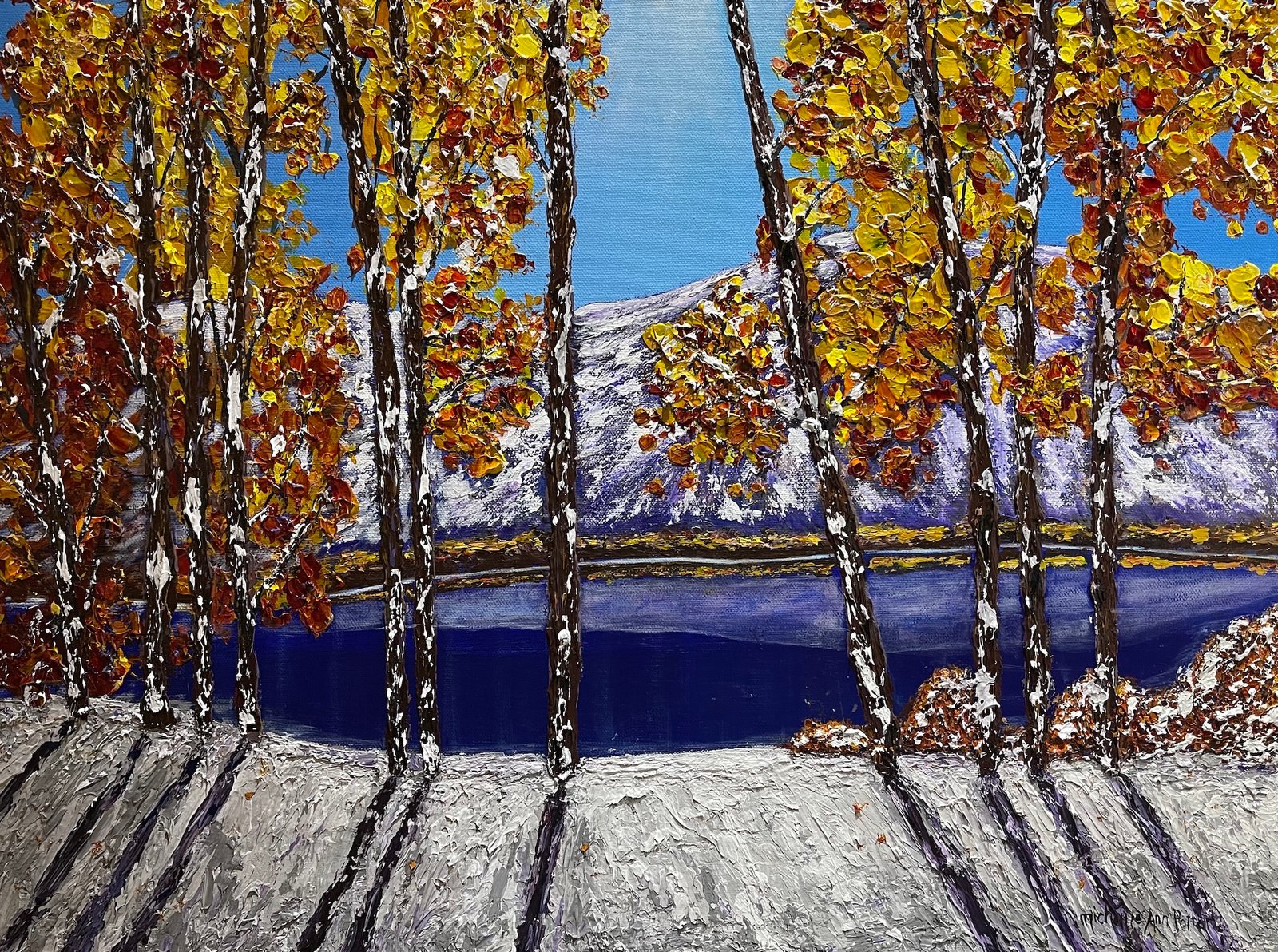 Depicts winter’s first snow around a lake with viewed through birch trees brimming with fall leaves with mountains in the background.